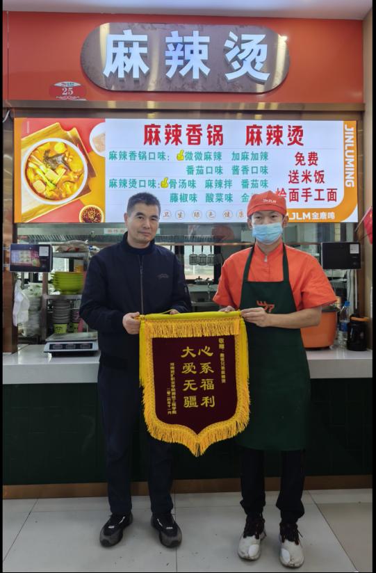 1. 员工餐厅1楼“趣筷兄弟麻辣烫”窗口为福利院捐赠20箱饮料,3044永利集团经理卢西魁为窗口赠送锦旗并表达感谢。