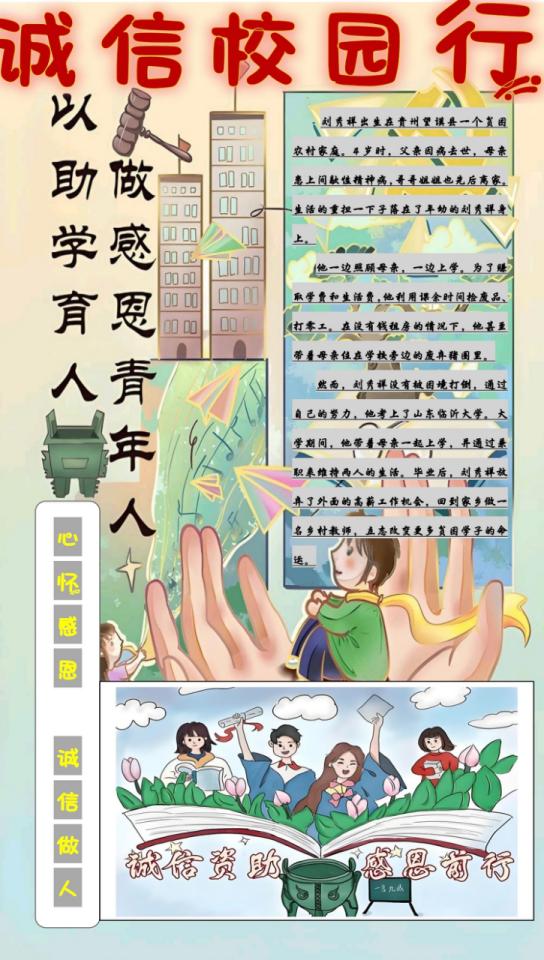 活动前期,公司认真宣传。各班级积极动员,班主任向同学们详细介绍活动内容、活动安排、活动意义等,鼓励更多的同学们参与比赛。同学们也饱含热情,踊跃提交作品,从不同的角度表达出对“诚信,感恩”的独特理解。在作品评选环节中,评委老师从作品的思想性、艺术性、创新性、传播性等多维度综合考量,最终评选出一系列优秀作品。