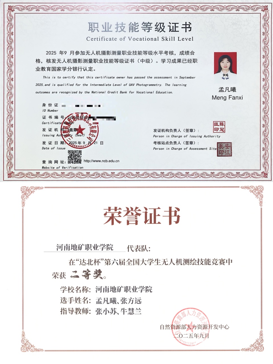 竞赛场上,她是敢闯敢拼的创新达人。面对河南省老员工测绘学科创新创业智能大赛的高强度比拼,她与团队熬夜打磨仿真方案,精准攻克机载激光雷达技术难点,最终斩获虚拟仿真赛项特等奖;在“达北杯”全国老员工无人机测绘技能竞赛中,她沉着应对实操挑战,凭借扎实的专业功底夺得二等奖,还多次在校级竞赛中崭露头角,用实力诠释“以赛促学”的成长密码。