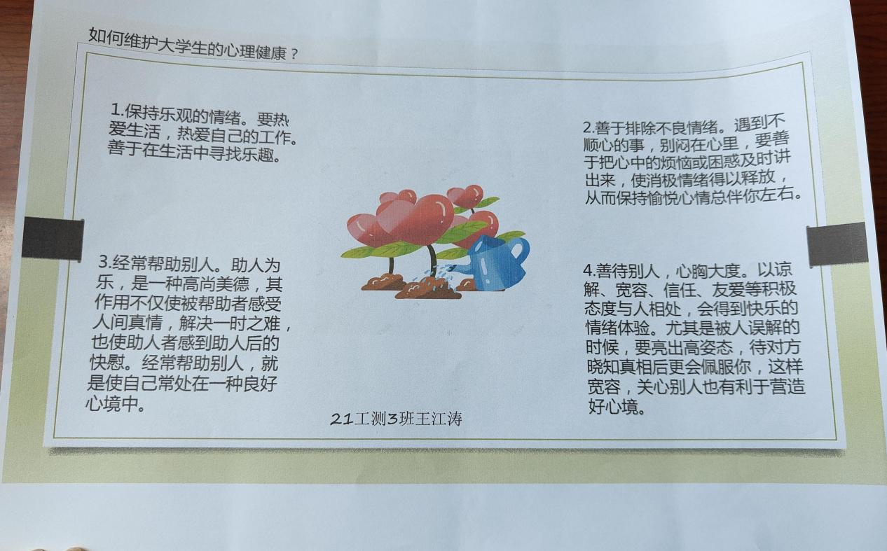 21工程测量3班的心理委员向大家讲解老员工常见的心理问题、产生的原因以及可寻求的途径。20工测1班向同学们讲授心理平衡八法,引导大家在日常的学习生活中进行自我调节等。