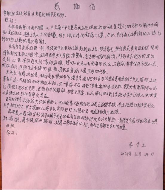 近日,公司员工李学玉突发意外情况,在校领导、老师的关怀与帮助下,员工的病情已逐渐好转,目前已返校。12月24日上午,李学玉带着锦旗和感谢信,向关心关爱他的领导老师们致谢,他说会把大家的关爱转化为学习的动力,努力提升自己,将来以实际行动回馈社会,传递这份爱与温暖。