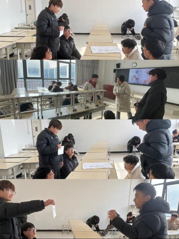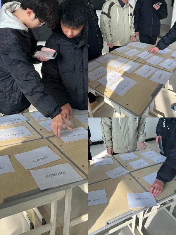 赛前,班长和学习委员从英语教材与课外拓展资料中精选词汇,涵盖拼写、翻译等,同学们组队备战。赛前特别组织了试抢答,让同学们熟悉规则。竞赛中,“根据释义抢答单词”紧张刺激,答对得分的欢呼与答错扣分的叹息交织;“单词蹲”考验团队默契;“抢椅子”别出心裁;“同学请就位”更是将气氛推向最高潮,两组同学隔布对峙,听令而动,迅速识别对方身上单词,用时短者获胜,每一轮比拼都伴随着同学们的呐喊助威。